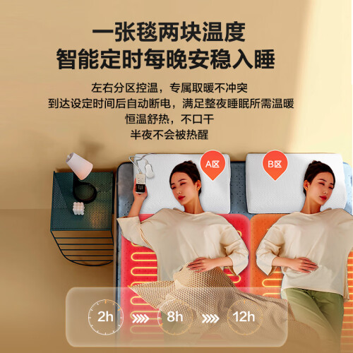 面料升级加厚细密暖绒材质,睡感更加柔和,保暖舒适。还支持智能定时、12h自动断电、高温断电保护,老人、儿童也可放心使用。