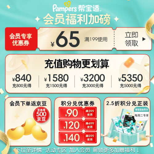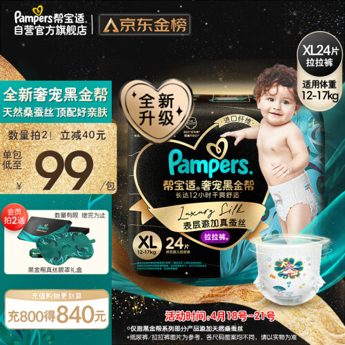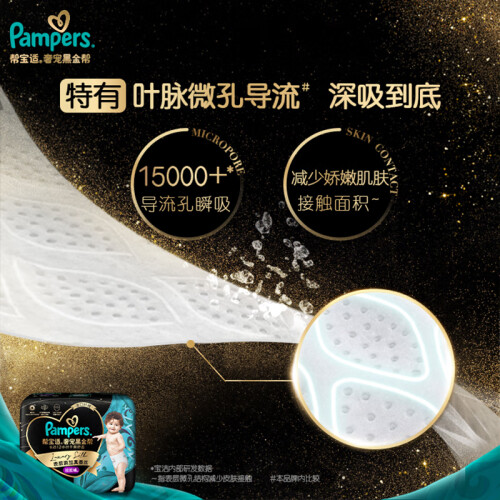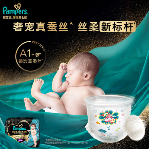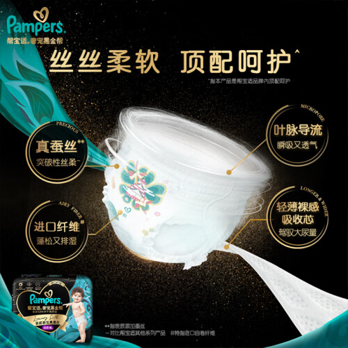 帮宝适是美国宝洁公司旗下著名的婴儿护理品牌,全球知名的纸尿裤品牌之一。旗下有一级帮、清新帮、纯净帮、绿帮等系列纸尿裤。本款肌之奢宠黑金帮系列是帮宝适2021年最新推出的首款含天然桑蚕丝的纸尿裤,天然桑蚕丝细至宝宝毛发的约1/2,让面层摸上去像丝绸般顺滑柔软,不摩擦宝宝皮肤不易造成刺激,茧型环抱设计像为每个宝宝量身定做一样,任何形状的屁屁都能轻松贴合,宝宝穿着更加舒适而且不易发生漏尿情况,叶脉导流表层加速尿液下渗速度防止回渗,同时还能排湿排热不易闷屁屁,4000次扭动不变形,适合爱动宝宝穿着,包装上汲取了丝路灵感,融入敦煌、伊斯坦布尔、罗马艺术元素,灵动绚丽的漫画跃然“裤”上,高级感满满。