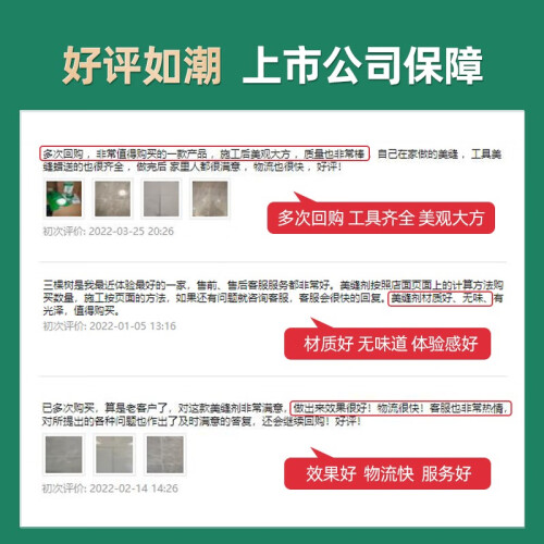 此款美缝剂高分子环氧共聚合,形成抗潮因子,从而降低发霉,阻挡多种油污,耐水性能优,优良的粘贴性能,保证美缝剂和瓷砖墙地面的粘结,有效防脱落,胶体光亮如玉,硬度高,坚韧如瓷,耐刮耐磨,历久弥新。