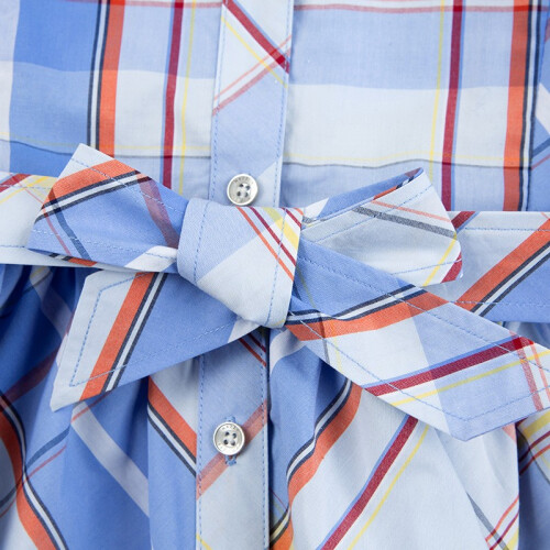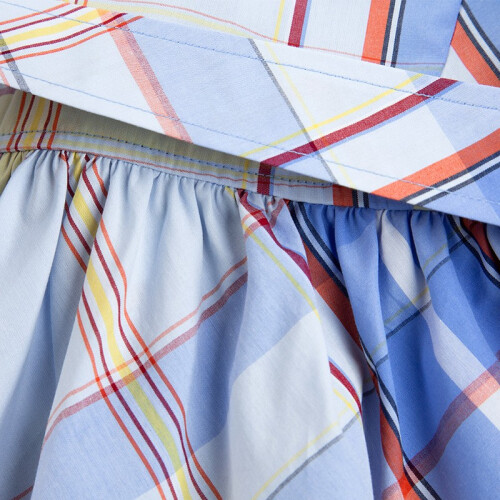 色织格棉平布,质地坚牢不易变形,表面平整,挺括有型,有较好的吸湿透气性,裙式下摆藏肉显瘦适合各种体型小朋友。