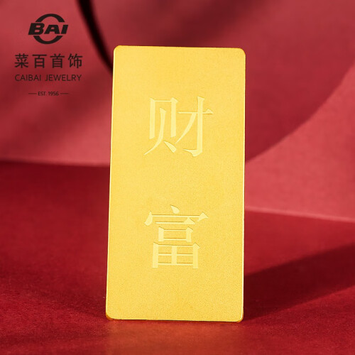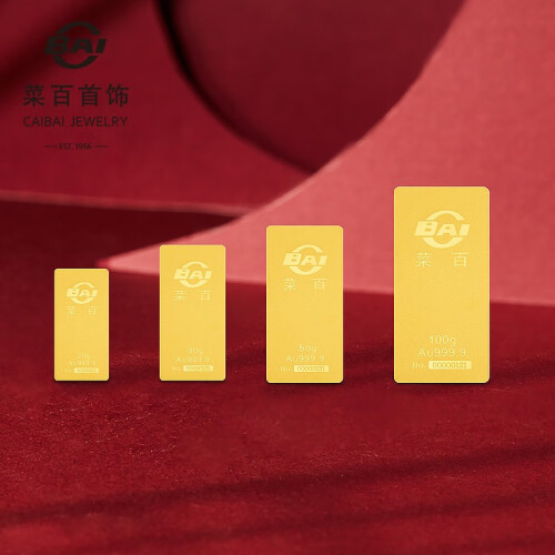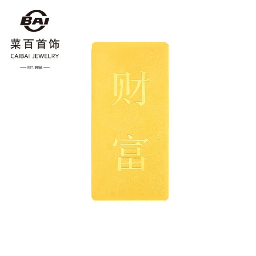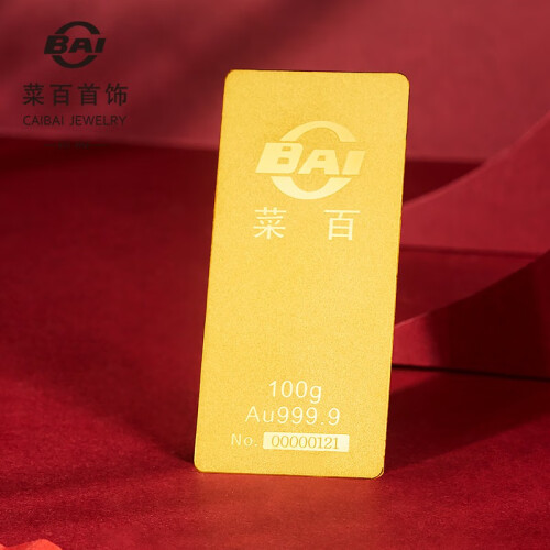 菜百首饰是北京菜市口百货股份有限公司的品牌,主营足金、千足金饰品、摆件、金条、铂金、钻石、翡翠、白玉、珠宝、金银币章、K-gold及18K金、银饰品等大类商品,拥有中国金币特许零售商资格,是北京规模最大、品种最全的黄金珠宝首饰专营公司。这款金条为长方形,克重:20g。