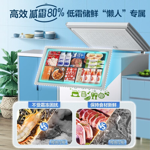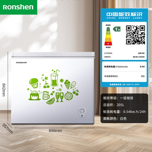 BD/BC-205MB冷藏冷冻转换冰柜: ① D型蒸发器:创新D型管 蒸发管与内胆横面接触 增加冷冻面积 S型冷凝器: 四面S型盘管散热 高效降温 ② 100小时断电保护,从-36度~0度缓慢升温 ③ 一级能效,日耗电0.54度 ④ 10KG大冷力,12小时即可冻透20斤肉 ⑤ 八档调温 四大模式 ⑥ 纯白钢丝篮网,大空间,分类储藏 ⑦ 4W安全:宽电压 宽气候 宽温度 宽气候 产品尺寸(mm)899x557x842