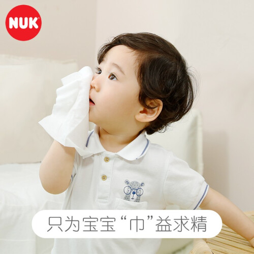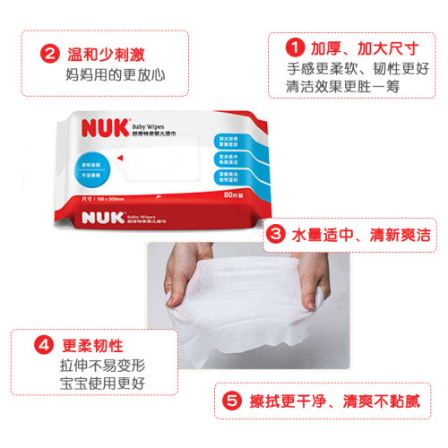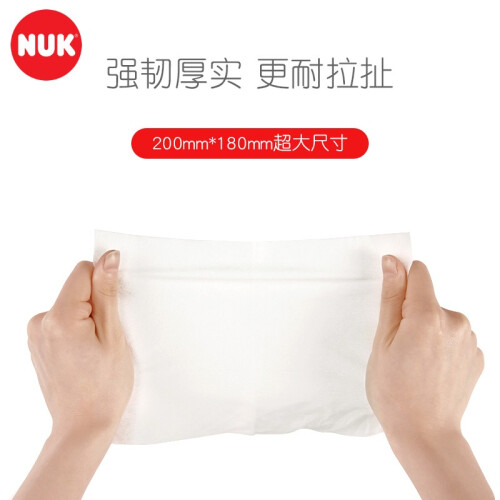 NUK湿巾以无污染、不刺激著称,不添加酒精、香精、荧光剂,采用EDI水份,温和配方,给新生儿肌肤更多安全,业内有口皆碑,价格也相当坚挺,适用年龄:婴幼儿及成人。