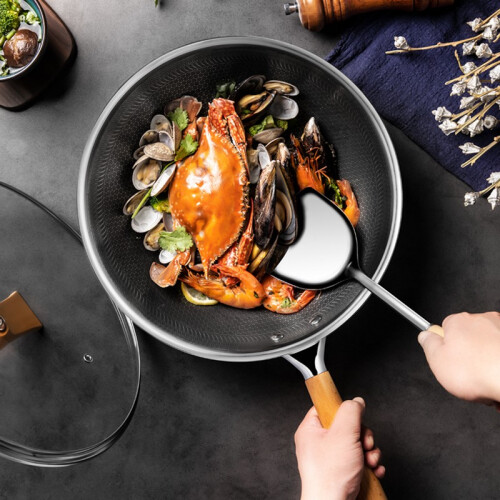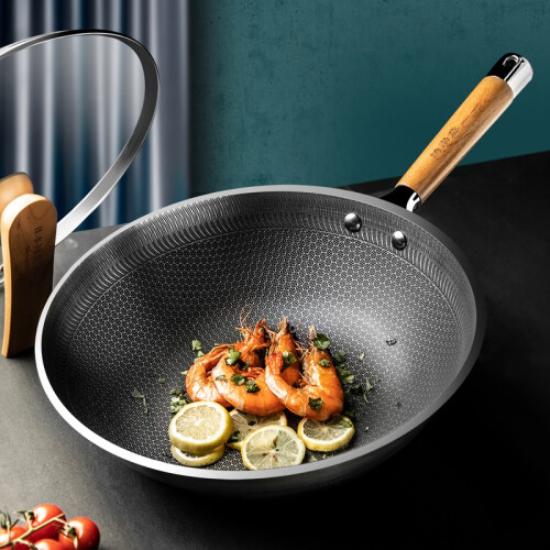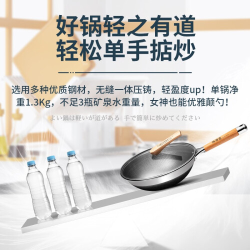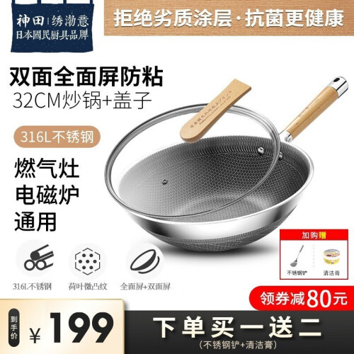 神田推出的这款炒锅,选用316L不锈钢材质制作,表面带有荷叶微凸纹,不易粘锅、糊底,防刮耐蚀,不挑锅铲。厚底薄壁的锅身,导热快速,受热均匀,可减少油烟产生。可立式锅盖,竖立放置,不占空间。榉木手柄,隔热防烫效果好,握感舒适。