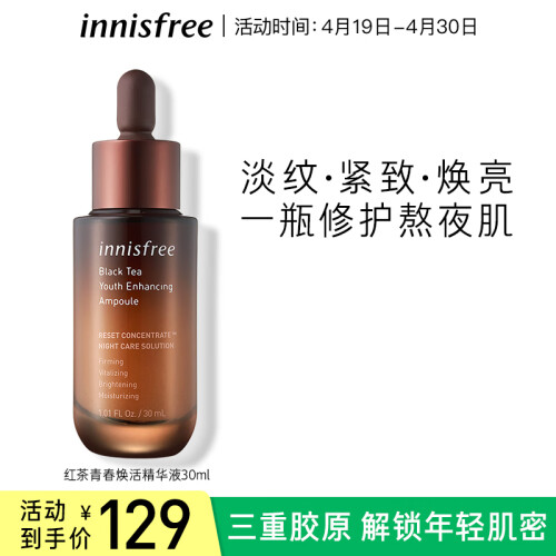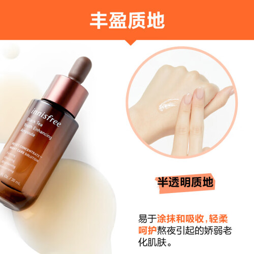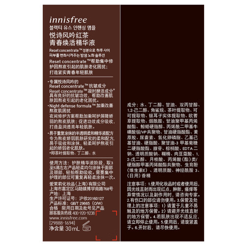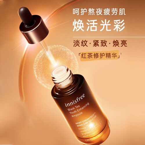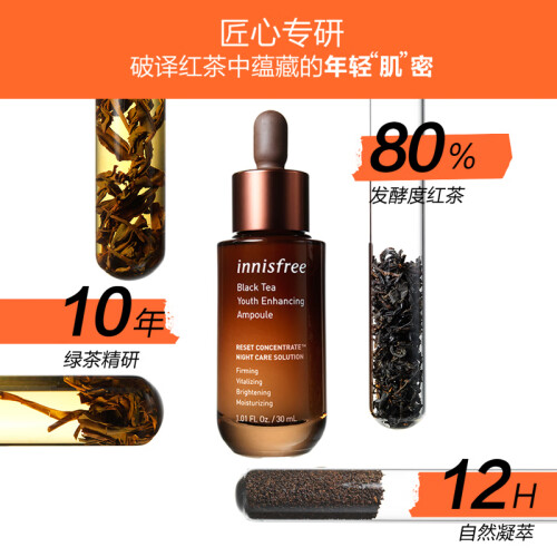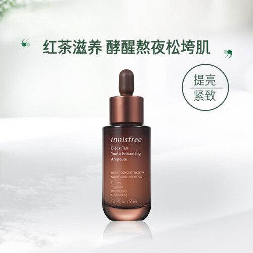 这款红茶精华主打“补水、保湿、抗初老”明星成分:济州红茶;从韩国济州红茶发酵物种萃取出具有抗老功效的高分子发酵茶褐素,从而进一步萃取出rest concentrate™(凝时酵活成分),经官方力创测试数据,该成分有效改善因熬夜而导致的肌肤初老症状。另外,精华中添加了烟酰胺的成分,在提升和改善肌肤光泽方面有很好的作用;神经酰胺+尿囊素,帮助加强肌肤保湿屏障,修护娇弱的肌肤。有效抑制有害的自由基,改善肌肤弹性。透明质酸进一步深入补水保湿,增加肌肤水含量、持久锁水的功效让皮肤喝够水,喝好水。