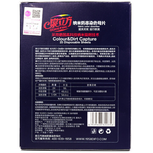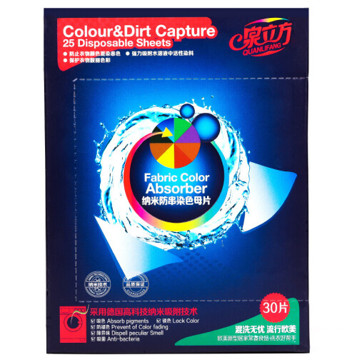 混洗无忧,轻松省力,固色护色。特殊物料,网状结构,吸附力好,采用纳米吸附技术:新代纳米吸附技术,有效吸收并锁牢游离色采彩粒子,适用于彩色衣物,尤其是混色采及间条类衣物。即用即抛:适用方法简单,如同纸巾使用,轻松方便,是日常洗衣过程中不可缺少的彩衣伴侣,无磷环保,机洗均可。