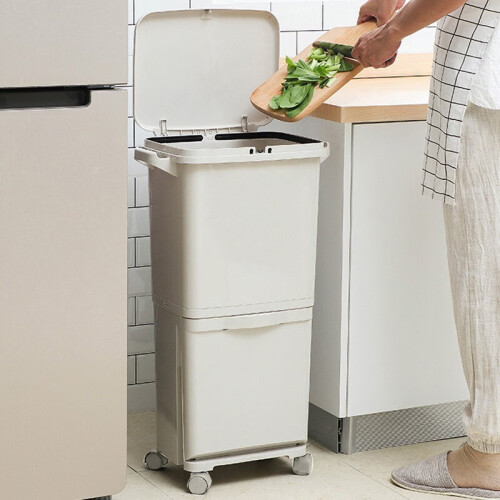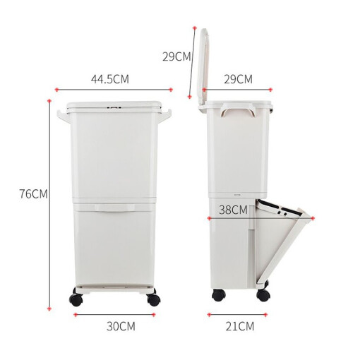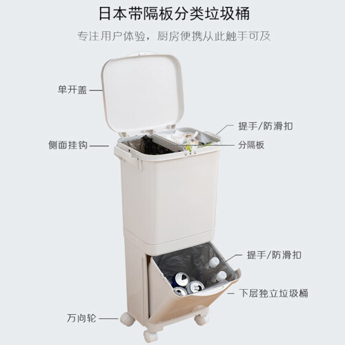 家の物语双层分类垃圾桶,干湿分离,上方湿垃圾,下方干垃圾。大容量,按压式开盖,更方便。底部万向轮设计,随意拖动,灵活省力。桶身纤细,可以侧放厨房缝隙,有效节省空间。