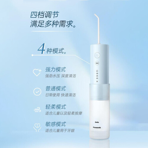 松下EW-WDJ3B冲牙器拥有4种冲牙模式,机身上可以选择强力、普通、轻柔、敏感四种模式。适用于对口腔清洁有高要求、牙齿敏感问题、矫正箍牙及儿童日常清洁口腔使用。具备150ml大容量水箱,并且可拆洗,使用更加安全卫生,加满水普通模式一次可清洁约65秒,强力模式一次可清洁约55秒。采用松下原装锂电池,充满电仅需60分钟。松下EW-WDJ3B冲牙器具有四种颜色,造型小巧方便便携,整机IPX7级防水。