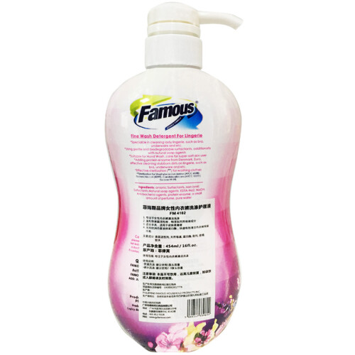 famous 菲玛斯 女性内衣裤洗涤护理液 454g,成分含有表面活性剂,天然皂液以及蛋白酶等,可深层洁净,祛除血渍、污垢等,软化硬水,穿起来更柔顺舒适,洗后带有天然花香。