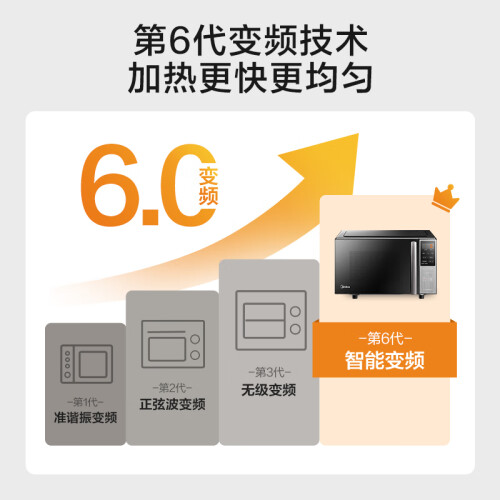 美的第4代变频技术,加热更快更均匀能耗更低,变频大火力,均匀高效加热再忙也能轻松享用一日三餐,五档变频,全程火力自动调节,100W-800W智能变频火力, 火候精细拿捏,新手烹饪无难度。