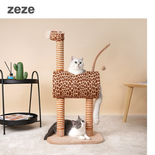 该款设计灵感来源于非洲草原动物-长颈鹿为原型,将猫爬架、猫隧道、猫抓柱结合为一体,是猫咪休闲娱乐的好伙伴。爬架采用时尚且柔软的松针绒面料,猫猫躺我更加柔软舒适,同时也方便清洁打理。长颈鹿的脖子和四肢采用双色加粗剑麻绳缠绕支柱,给到猫猫随心磨爪的空间。提高稳定性的同时更加耐磨。底盘使用E1高密度板牢固设计,给猫咪提供安全保障。