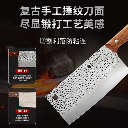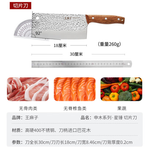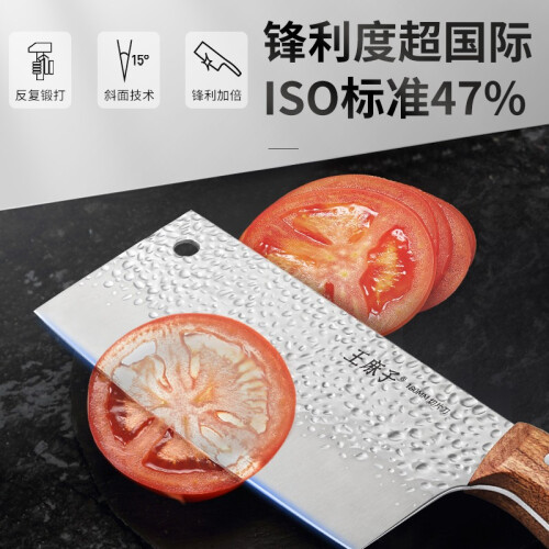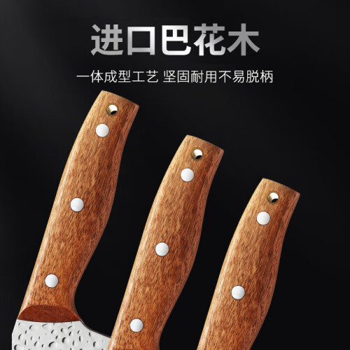 选用高硬400不锈钢,精选洛氏高达55HRC不锈钢远超ISO标准,1200度温差冰锻淬火工艺,加强刃口的耐磨性和抗腐蚀性。进口巴花木,一体成型工艺坚固耐用不易脱柄。