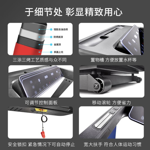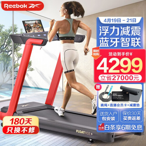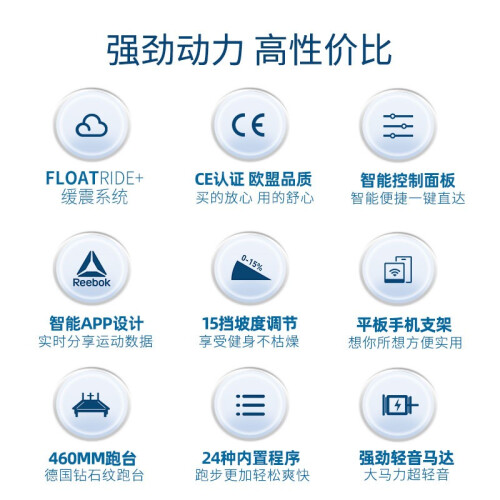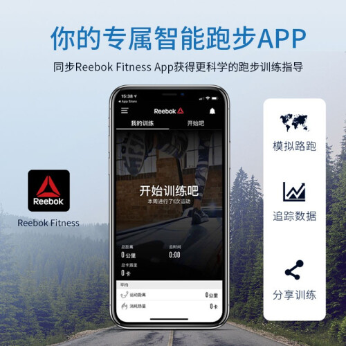 此款跑步机采用锐步FLOATRIDE+浮力缓震系统,降低膝盖损伤,2.25匹强劲马达,18KM/H高配速,46CM款德国西格林跑带,防滑,耐用;手握式心率监测,帮助跑者进行科学运动;15档电动坡度扬升,24组运动模式,提升运动效率的同时,带来更好的运动体验;蓝牙同步Reebok Fitness APP,追踪您的每一次训练,获得更科学的跑步训练指导。