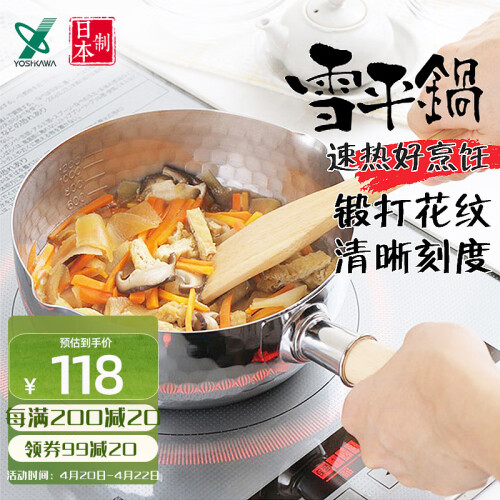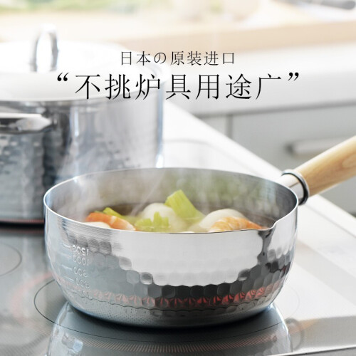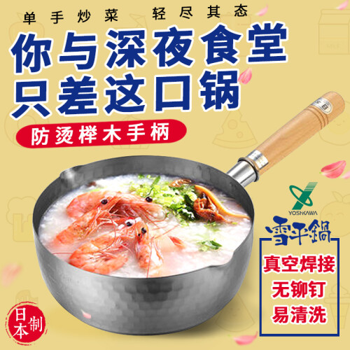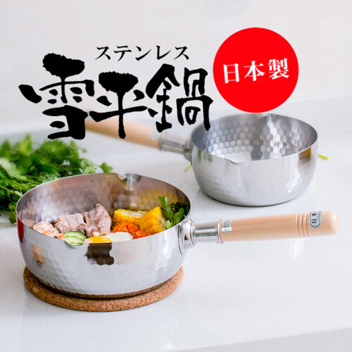 雪平锅是日本料理中常用的一种锅具,几乎每个日本家庭都会用到这只锅,这款雪平锅来自有着近70年的悠久历史以金属加工闻名日本的株式会社YOSHIKAWA吉川旗下,以锅身施以白雪般的加工图案而得名。既可炖汤,也可煮菜,锅身内侧附有刻度,方便又实用。锅的两边均设计有倒流口,方便倾倒食物。采用了天然木质手柄,光滑圆润,手感更加舒适,还可以拆卸。规格:容量:2.1L,可做大约3人份面条;