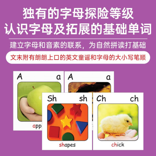 该书主要学习26个字母以及4个组合字母的大小写及发音,一本书讲一个字母,最后一页配有一首字母童谣,封底有大小写字母的书写顺序。字母探险家包含以下特点:认识字母;认识字母的大写和小写;通过图文关联认知单词;学习英语音素;通过押韵童谣复习字母;封底教授字母书写顺序。内含小考拉点读笔,字母探险家,适合英语0基础的孩子。