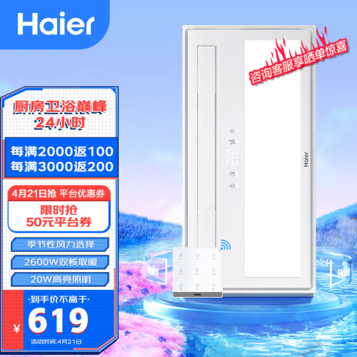 当前的位置: 首页 > 今日值得买 > 海尔浴霸风暖浴霸排气扇照明一体八合一暖风机浴室集成吊顶灯浴室灯V7