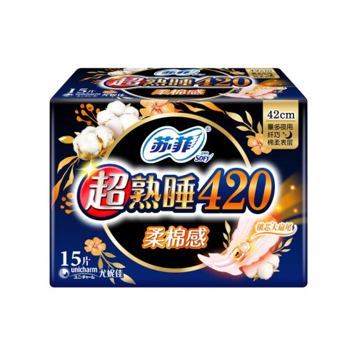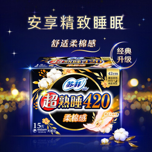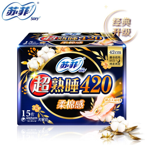 苏菲卫生巾,于日本开发,是尤妮佳公司针对现代女性推出的卫生巾品牌,提供优质的卫生巾、护垫产品,适应现代女性需求的多样化,高端化。这款Sofy 苏菲 超熟睡 绵柔感 夜用卫生巾,新升级420mm,绵柔表层,亲肤舒适,超大蝴蝶扇尾,量多夜晚也可以放心翻身。