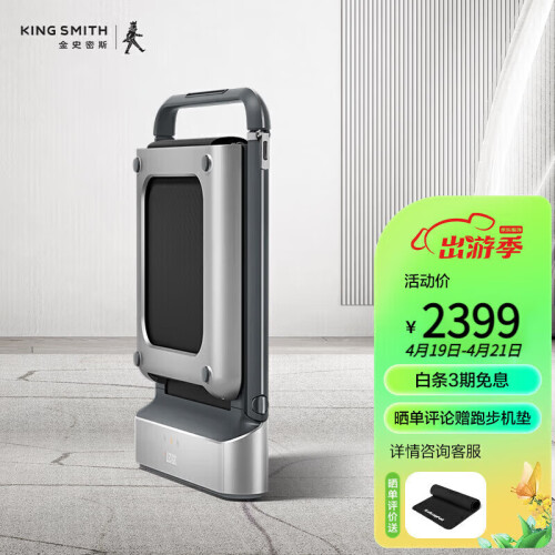 KINGSMITH 金史密斯 WalkingPad R1 可折叠平板跑步机,采用金史密斯家族史可折叠平台专利技术,可将跑步平台180度对折,直立放置,厚度15cm,占地面积不足0.2平米。一机两用设计,可根据需求扶手可以收纳;无刷电机,减少噪音,耐用性和稳定性更好;三种方式操控,遥控器、脚感控速、APP控制。