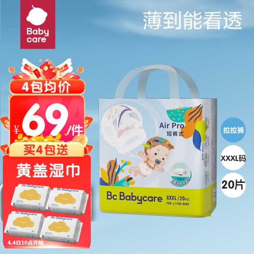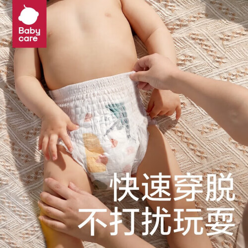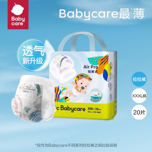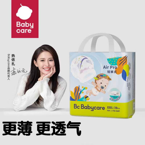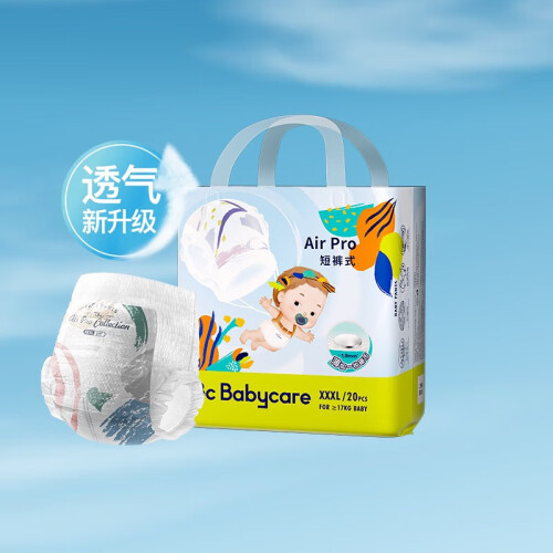 Babycare是杭州贝咖实业有限公司旗下的品牌,目前国内最具朝气和市场竞争的母婴品牌之一,Babycare始终以关注婴幼儿身心特点为核心理念,甄选全球经典原料,全力打造让婴幼儿舒适、让妈妈放心的产品,旗下有艺术大师、皇室、飞享、Air超薄等系列婴儿纸尿裤。本款Air超薄系列拉拉裤采用革新性极薄工艺,在不改变鲸吸芯体的前提下,为上、下层选用成本更高更薄更柔的材质,呵宠裸感小屁屁,并且进一步改善了底层透气膜的微孔结构,透气量提升10%,透气不透水,让宝贝干爽自在。内置高分子魔力吸水珠,能吸收自身重量的50倍,吸水量高达600ml,相当于宝宝6次尿量,智能导流通道,全方位瞬吸导流,拒绝鼓包、拒绝断层。精准弹力腰围设计,不勒小肚肚,小内裤设计好穿易脱。