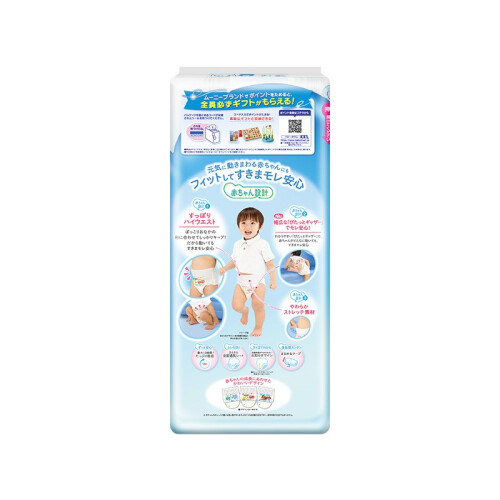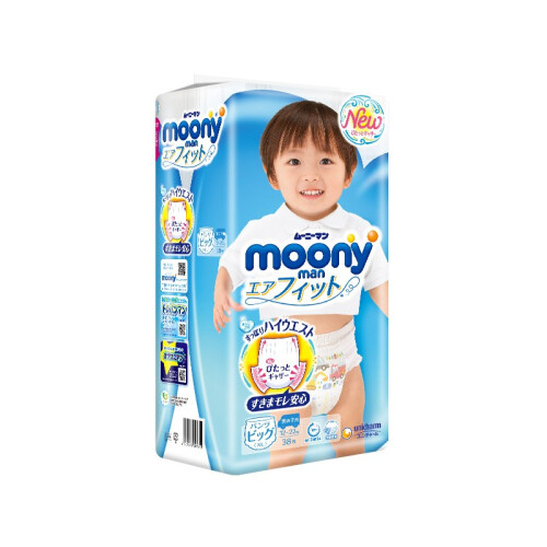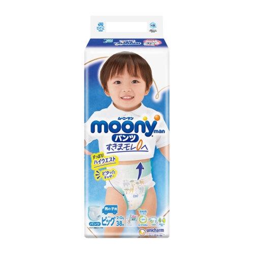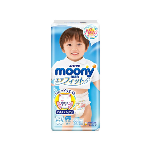 moony纸尿裤是日本unicharm尤妮佳集团旗下的纸尿裤品牌,是日本四大品牌纸尿裤之一,享有“尿裤之王”的美誉。其母公司在中国运营有“苏菲”妇女生理用品及“妈咪宝贝”婴儿纸尿裤等产品。moony是其日本原装系列,这款XL38码的男用拉拉裤,质地柔软对皮肤刺激很小,外侧使用轻柔额化纤衬垫,超薄吸收体,具有前侧吸收,预防往前渗漏。XL码适合12~20kg的宝宝穿着,规格38片。