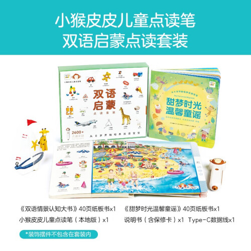 2本大开本纸板书,搭配上千本中英绘本点读资源小猴皮皮点读笔,帮助低幼宝宝开启智能学习中英双语第一课:《甜梦时光温馨童谣》包含20首百年经典英语童谣,搭配点读笔,可听原汁原味中/英双语朗读、配备编曲的童谣歌曲,还可跟唱、回放录音,更有互动认知游戏边玩边学;《双语情景认知大书》包含20幅低幼宝宝熟悉的现实生活场景大图,500+双语词汇,上千个可供视觉大发现的细节,精心设计2600+点读互动游戏,学认知、学单词、学常识、看图说话、玩专注力游戏……从0岁开始培养双语宝宝,一“笔”搞定。
