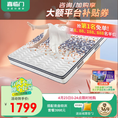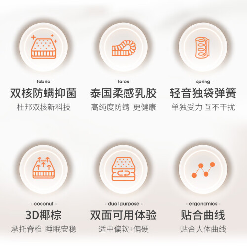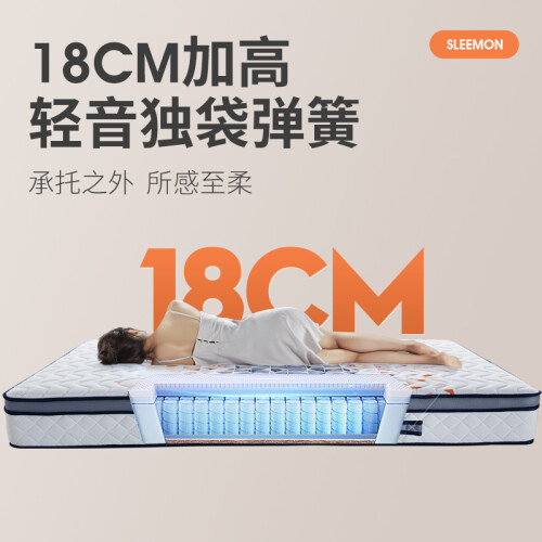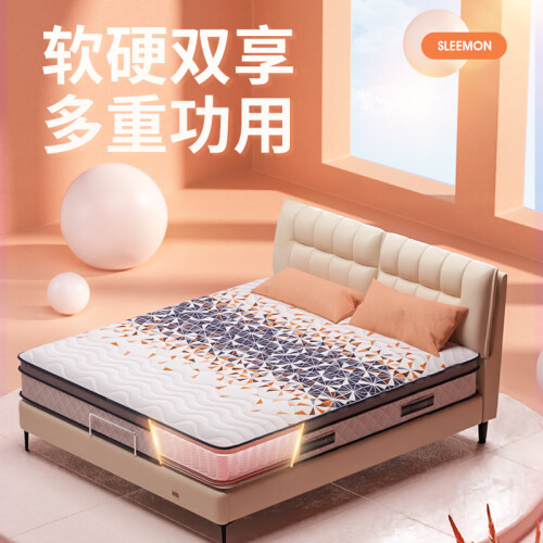 这款蝶梦床垫,独立袋装弹簧支撑,相对静音,依旧是实用的双面可睡设计,软面为针织透气面料+泰国乳胶,硬面为3D椰棕+梭织面料,适合夏天或者喜欢睡硬床的朋友。床垫除乳胶+椰棕+纳米海绵填充外,新增的蛋形海绵使得床面分布上千个按摩触点,有助于睡间释放压力,3D透气周围可以有效帮助床垫内层形成空气置换。该款床垫厚度24cm,规格有1800*2000、1500*2000、1500*1900。