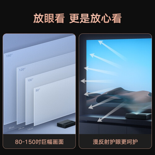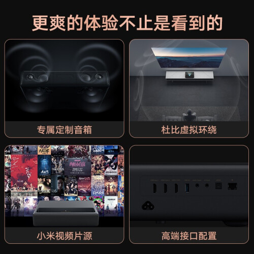 米家 MJJGTYDS04FM 1S 4K激光投影电视采用TI DLP数字光处理技术,画面分辨率达到4K,原生对比度为3000:1。该机采用全新一体化设计光机,相较于上一代产品,整体亮度提高30%,画面平均亮度达到2000ANSI流明,白天环境光下精彩画面依然清晰生动。 在显示性能上,这款投影机拥有HDR10解码,更好的支持了高动态范围画面的呈现,复合国际电信联盟Rec.709标准,宽广色域分布,色彩更丰富。该机搭载的ALPD3.0显示技术,让人物色彩更自然鲜活,配合ISF认证工程师精心调教,色彩还原度偏差≤2.9,让色彩表现更真实。 在投射距离方面,该机采用0.233:1大景深超短焦镜头设计,机身距离墙面仅需24cm,即可投射100英寸大画面,没有布线烦恼,可投射80-150英寸。镜头两侧各有1颗防直视传感器,有人靠近时,自动将投射亮度降至最低。采用双全频+双高频音响系统,更真实、更沉浸,内置PatchWall人工智能系统,海量内容,精彩呈现。 此外,这款激光投影电视的光源使用寿命达到25000小时以上,背部设计丰富的接口,比如3个HDMI 2.0b接口,充分满足4K娱乐需求,硬盘播放器、U盘、游戏主机、电脑、电视盒子、音响都能接入。