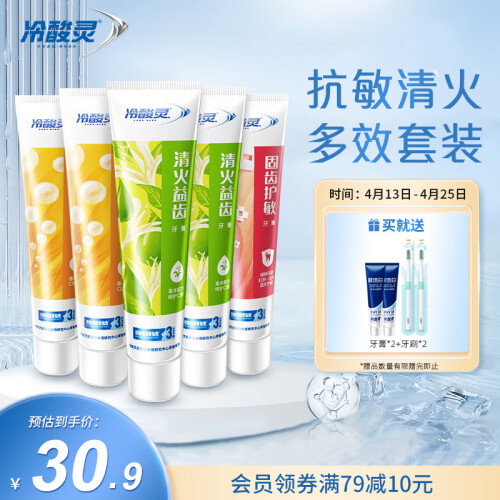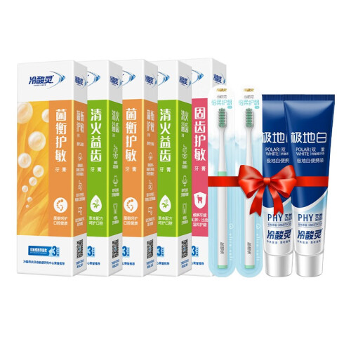 冷酸灵牙膏是个民族品牌,主要以抗牙齿过敏为主,中国80%的抗过敏牙膏都是冷酸灵出的。"冷酸灵"是公司的主打牙膏品牌,自投放市场以来,以解决牙齿敏感、增强牙齿对冷热酸甜的耐受力等多种功效著称。冷酸灵以其"冷热酸甜,想吃就吃"的核心价值承诺,让消费者畅享生活美食,身体全面健康,深得消费者认同、信任和称赞。该系列产品已累计销量超过40亿支,并多次荣获"中国驰名商标"和"中国名牌"称号,是中国13亿人民的"牙齿抗敏感专家"。这款套装包含冷酸灵优护抗敏牙膏,水果薄荷香莹白膏体120*2,冷酸灵清火益齿牙膏,清爽薄荷香莹白膏体120*2g,冷酸灵菌衡抗敏牙膏,沁香薄荷香莹白膏体120g;