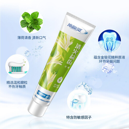 清火益齿牙膏,清新口气清凉舒爽,薄荷清香,清新口气,精选温和磨粒,不伤牙釉质,特含抗敏感因子,缓解牙齿疼痛,蕴含金银花精释原液,缓解上出血问题