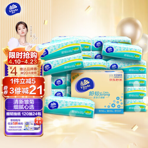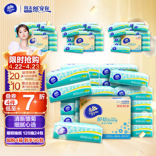 当前的位置: 首页 > 今日值得买 > 维达(Vinda)抽纸 细韧抽纸120抽*24包S码 卫生纸 纸巾 餐巾纸 纸抽 整箱