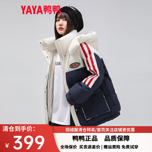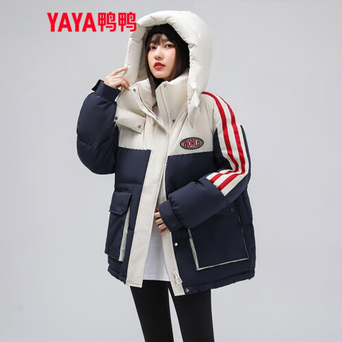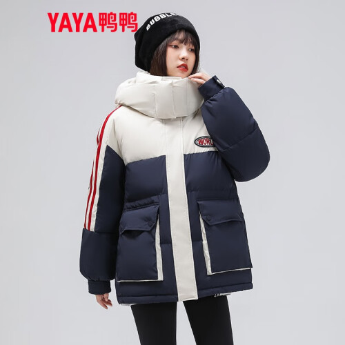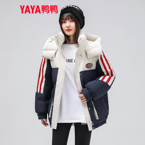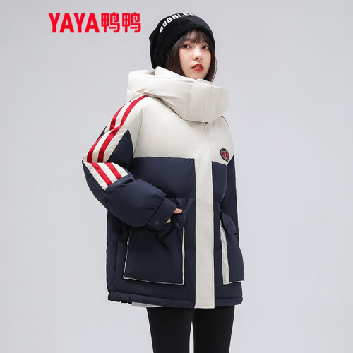 YAYA 鸭鸭羽绒服 女士羽绒服 DYS06B0180,H版型线条流畅利落,可翻领、立领、连帽,时刻凸出造型。撞色设计,时尚不单调。