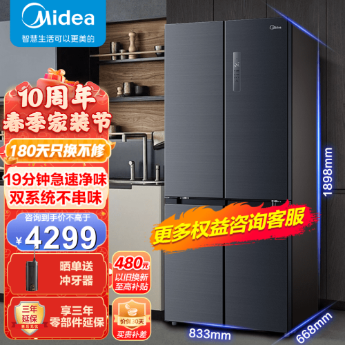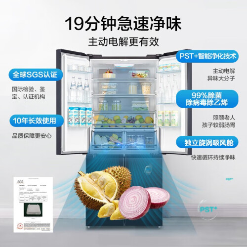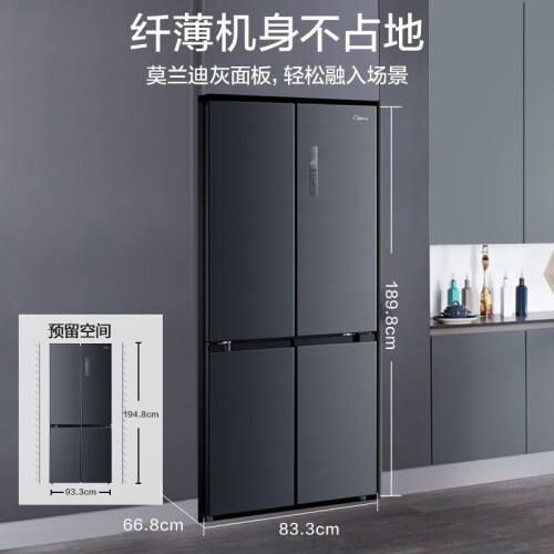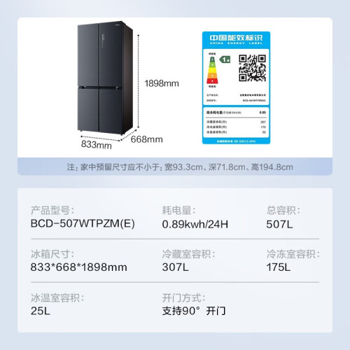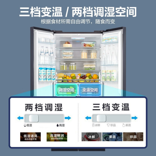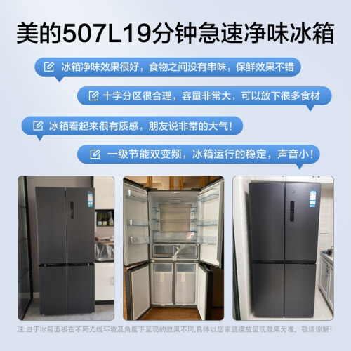 美的(Midea)这款型号为BCD-507WTPZM(E)的十字对开门冰箱,总容积高达506升,采用了风机+压缩机双变频设计,冷冻能力6KG/12H,日耗电量0.89KWh,达到了1级能效。带有PTS超磁电离净味功能,可有效分解异味气体并高效除菌,净化内室空气。中层变温室支持温湿双调,三挡湿度调节,有效提升保鲜时长。内置多个雷达感温探头,随时随地进准感知,自由调节,温度波动小。
