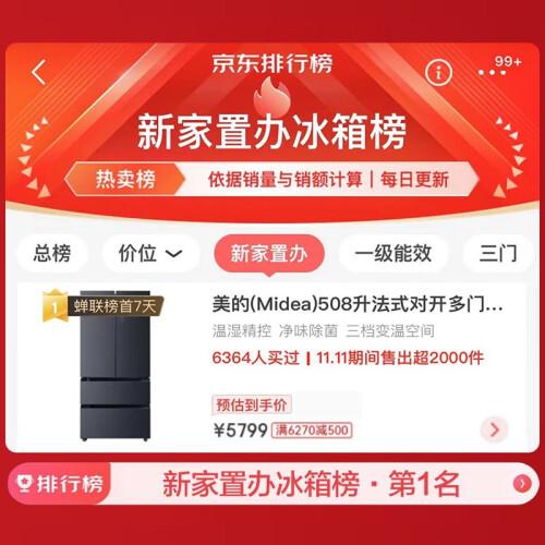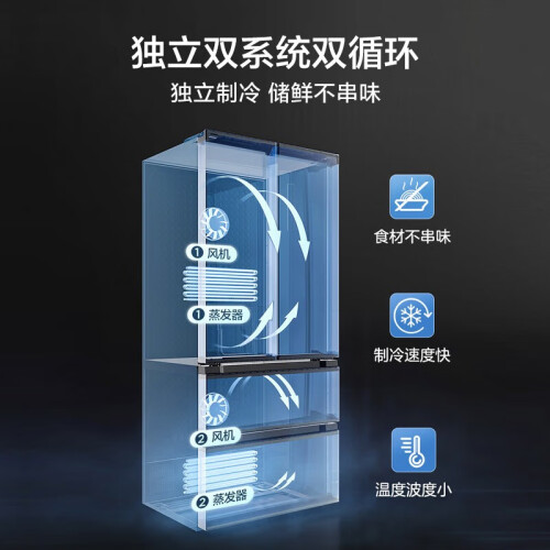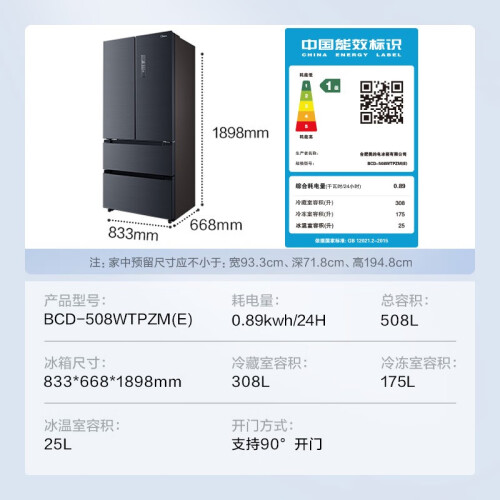 Midea 美的 BCD-508WTPZM(E) 法式多门冰箱 508L ,莫兰迪灰雅致外观,PTS+超磁电离19分钟快速净味,温湿可控,四门三温区,冷藏室308L,冷冻室175L,冰温室25L,双层直开式抽屉,变频压缩机+风机,支持WiFi控制,耗电量0.98度每天,一级能效,冷冻能力7.5kg/12h。