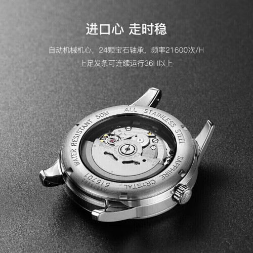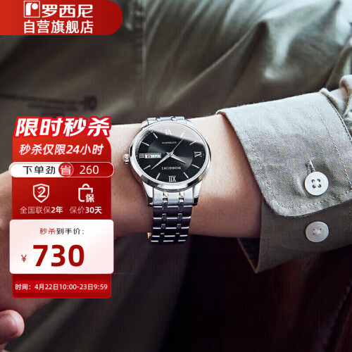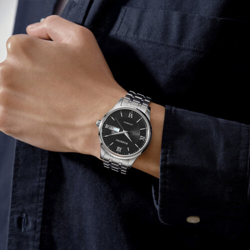 ROSSINI 罗西尼为经典国产腕表品牌。这款 雅尊商务系列 515701W04B 男士机械腕表,搭载进口机械机芯,黑色光泽表盘,太妃大三针,罗马数字标记3、639312点钟位置,3点位置有星期和日期的双利显示窗,边缘为分钟刻度。表壳直径约40毫米,厚约10.75毫米,蓝宝石表镜,50米防水。