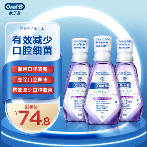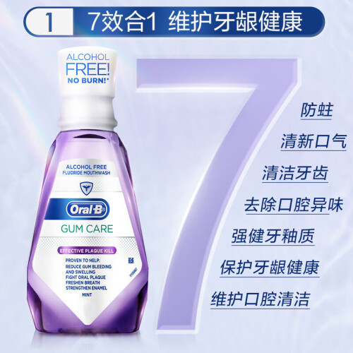 欧乐B(英语:Oral-B)是一个牙刷与其他牙齿护理产品(如牙线)品牌,由2005年收购了吉列公司的宝洁公司生产。Oral-B 欧乐-B 无酒精漱口水。这款漱口水最大的特色就是不含酒精,这对于口腔敏感的同学来说会非常合适,不用担心可能会刺激疼痛的问题。虽然不含酒精但是也都表现力非常的出色,它能深入清洁口腔内部难刷部位,杀灭隐藏在牙缝间及刷牙后残留的细菌,比单靠刷牙更能有效减少牙垢膜及牙龈炎的形成。使用方法:每次10-15ml的量(约半瓶盖的量),20-30秒后吐出即可。