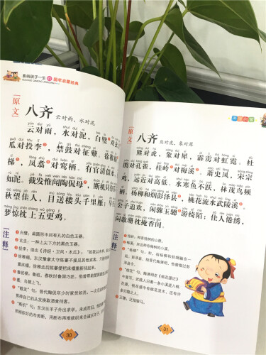 《笠翁对韵》是从前人们学习写作近体诗、词,用来熟悉对仗、用韵、组织词语的启蒙读物。作者李渔,号笠翁,因此叫《笠翁对韵》。全书分为卷一和卷二。按韵分编,包罗天文、地理、花木、鸟兽、人物、器物等的虚实应对。从单字对到双字对,三字对、五字对、七字对到十一字对,声韵协调,琅琅上口,从中得到语音、词汇、修辞的训练。从单字到多字的层层属对。较之其他全用三言、四言句式更见韵味。