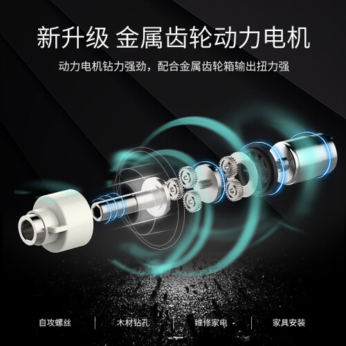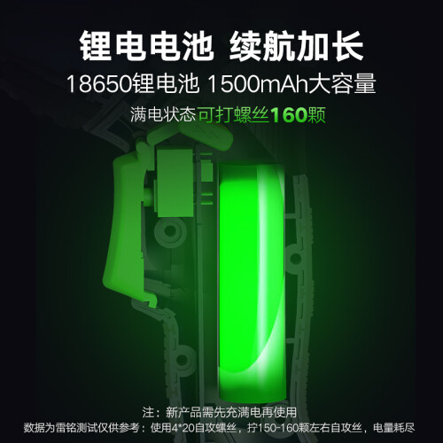 新升级金属齿轮动力电机,动力电机钻力强劲,配合金属齿轮箱输出扭力强,锂电配置续航加长,18650锂电池1500mAh大容量,满电状态可打螺丝160颗,贴心设计使用无忧,PUSH一键变形旋转机身。