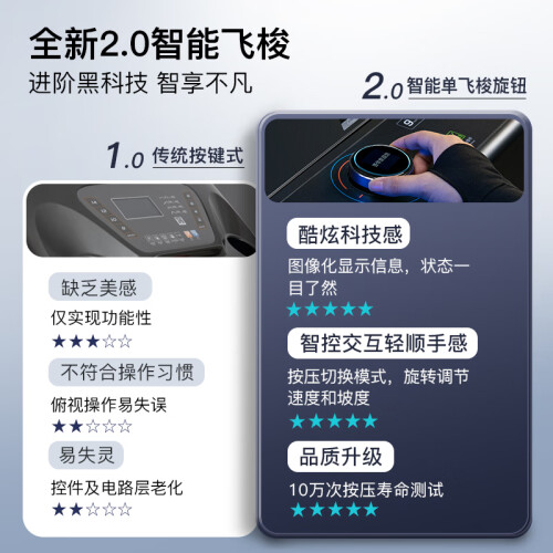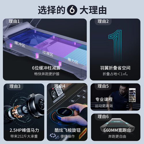 高颜值,全新造型设计,线条更简约美观,更能装点家居生活之美。15.6时大彩屏,可选15.6时大彩屏,让奔跑多分乐趣。高智慧,拥有一碰联华为运动健康APP智能功能可选。8核处理器,15.6时大屏内置8核处理器,运行更加流畅不卡顿。注:此配置为15.6时大彩屏所有。创新飞梭旋钮设计,既可酷炫显示按键信息,又可便捷操控480MM宽跑带。舒适跑台设计,采用更大面积的跑台设计,搭配精选材质跑带跑板,带来更舒适跑感。双马达设计,拥有2.5HP澎湃动力马达,搭配12档坡度扬升马达,满足多种运动需求。6位缓冲柱减震,内置6块高弹性硅胶减震块,畅快奔跑更护膝。252斤大承重,严格选材用料,创新结构设计,大承重奔跑更安全。