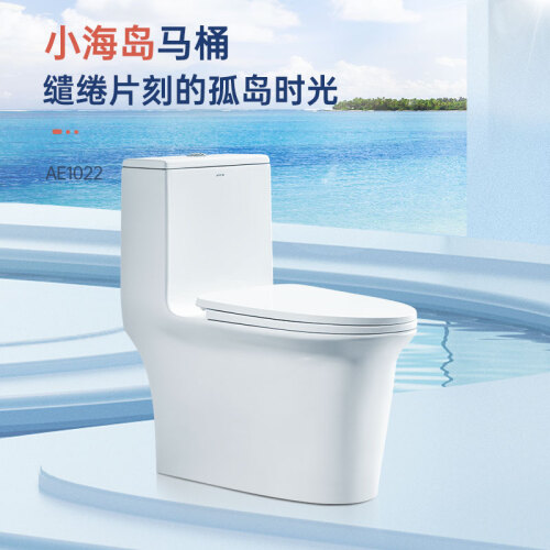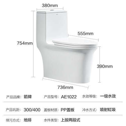 1994年创立的箭牌卫浴,总部位于著名的陶瓷产地广东佛山,产品系列包括卫生陶瓷洁具、高档实木浴室柜、PVC浴室柜、压克力浴缸、冲浪缸、淋浴房、蒸汽房、全铜质镀铬龙头、搪瓷浴缸及五金挂件等等。此款AE1022 连体式马桶,黄金比例高水箱设计,高位出水,迅猛有力,冲出强劲水流。强劲水流沿360°环布水孔高速喷射,二次坡度内壁设计冲力聚集,螺旋洗刷,果断卷走死角脏污。全管道施釉,不易挂污不留痕。90mm加宽管道,光滑排污,有效防堵。缓降脲醛盖板,高硬度,超长寿命。全包围盖板防污防尘,使用更卫生,清洗更省心。双档位节水设计,3.5L/5L冲水按钮,节能环保。