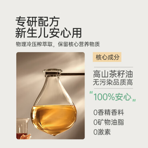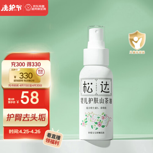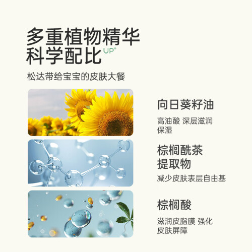 松达推出的这款婴儿护肤油,主要成分为山茶籽油,蕴含多种营养成分,其中的角鲨烷,亲肤能力强,能在皮肤表层形成保护膜,提升肌肤锁水能力;维生素E可以预防皮肤干燥、皲裂等问题。油状质地,易于涂抹。适用于婴幼儿和儿童。保质期为三年。