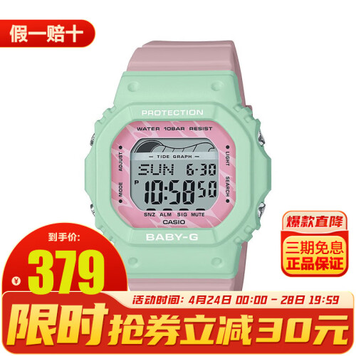CASIO 卡西欧 BABY-G系列 女士石英手表 BLX-565-3,树脂镜面与表壳,透光清楚,简洁耐用。针扣式表带,佩戴更加方便。粉绿撞色的搭配清新元气与碧海蓝天相映衬,在腕间尽情释放灵动气质。100米防水深度,满足日常生活所需。