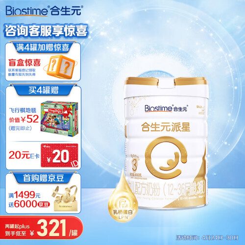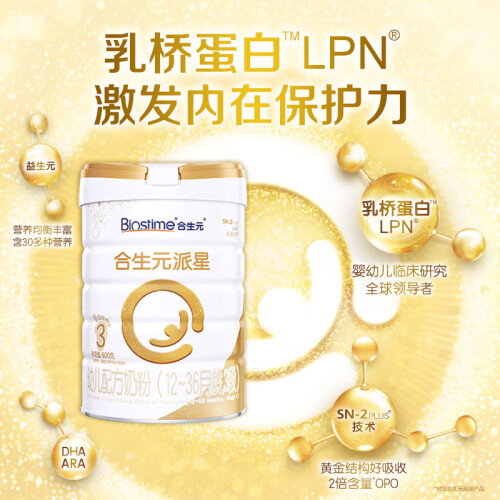 合生元派星,配方全新升级,突破性SN-2 PLUS+天然乳脂,黄金结构,亲和均衡好吸收,特别添加珍稀LPN乳清蛋白,激发宝宝自身保护力,给宝宝360度全方位保护,妈妈的智慧之选。3段适合12-36个月宝宝。