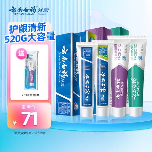 YUNNANBAIYAO 云南白药 520健康牙膏套装,内含留兰香120g+薄荷清爽型150g+益优清新 清新晨露150g+100g。