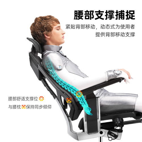 脊椎曲度变化捕捉设计,紧贴背部移动。椅背会根据使用者身体的活动,紧贴着背部上下、前后浮动“仿生脊椎骨”犹如人体脊椎,动态式提供背部移动支撑。
