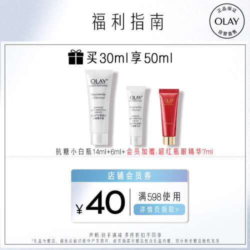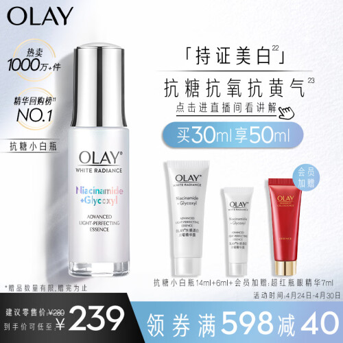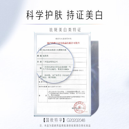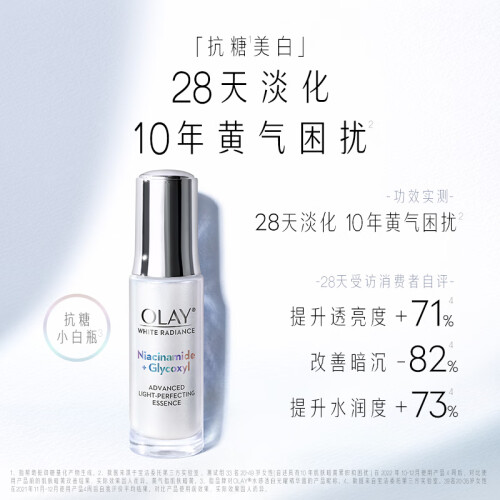 OLAY(玉兰油)是宝洁公司全球著名的护肤品牌,是中国区最大护肤品牌,由化学家格雷厄姆·武尔夫于20世纪50年代创立。目前产品涵盖PRO-X、OLAY MEN、OLAY三大系列。这款水感透白光曜精华露是经典光塑小白瓶的升级版,在原本美白淡斑的基础上新增抗糖化体系,保留了5%高浓度烟酰胺、抗坏血酸葡糖苷、十一碳烯酰基苯丙氨酸、己基癸醇、肌醇的美白体系,从黑色素产生到转移的步骤层层拦截色素沉积,同时添加的白睡莲中提取的革糖素,可以与烟酰胺协同减少AGEs糖化代谢产物的产生,保护胶原蛋白纤维弹性,改善因糖化反应而产生的肌肤暗沉枯黄,肌肤不仅白皙洁净,更通透明亮。全新的调香灵感来自莫奈花园,清新的琼花与海洋前调,淡雅的睡莲与紫藤中调,悠长温暖的檀木后调,一改经典神香,使用感更加高级。