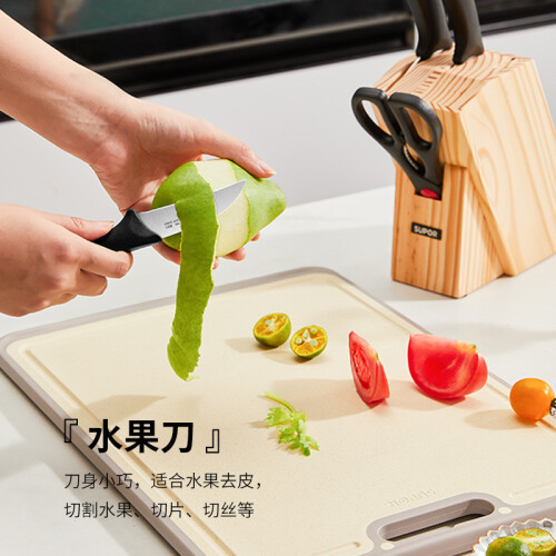 切片刀:刀身薄厚适中,适用于切片肉类,蔬菜等较软食物轻松驾驭。多用刀:切丝切片不粘连,防粘连凹槽设计,生熟分别使用不同的刀具,杜绝细菌滋生。果蔬刀:刀身小巧,有效减少食物汁水四溅,适用于切水果蔬菜挖孔等。刀尖角度:>60°,刀刃长度:151-220mm。