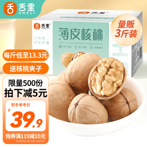 舌里的这款薄皮核桃,清洗后自然晾晒,再经人工挑选,颗颗均匀饱满,色泽纯正,壳薄好剥。果仁香醇不苦涩,肉质紧实饱满,细腻酥脆,自然甘甜。一箱装,分量足,卫生又防潮。保质期9个月,建议置于阴凉干燥处储存。