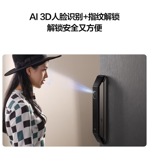 此款智能锁采用AI 3D人脸识别2.0,解锁安全又方便,更快、更准、更智能。3D深感摄像头根据飞行时间感知人脸深度信息,捕捉高达307200个深度点,解锁精准又安全。以16°仰角布置摄像头,覆盖78°更广视角,小孩子无需抬头,成年人不用弯腰。