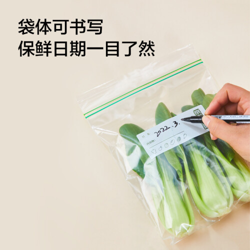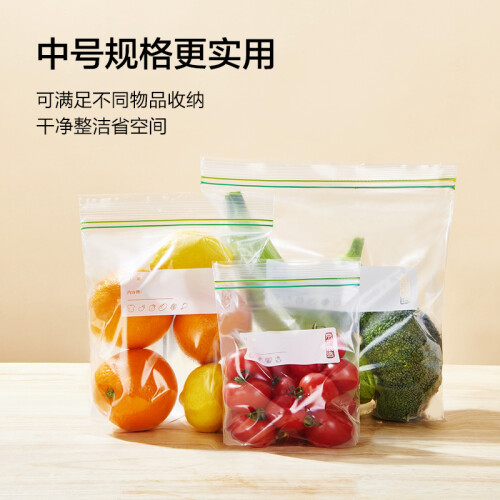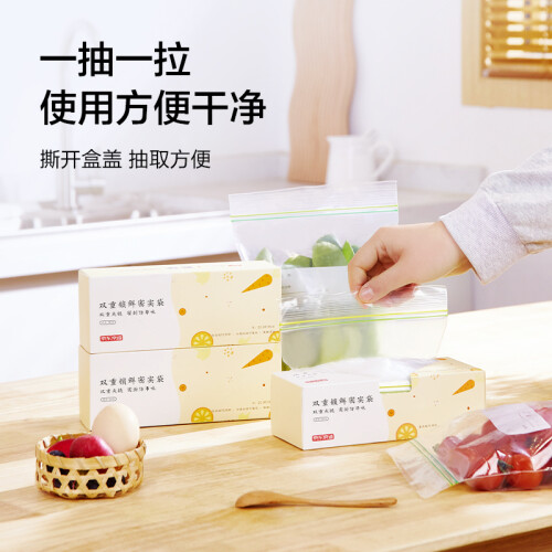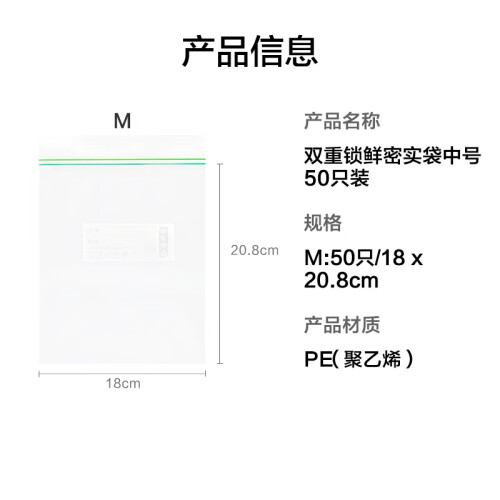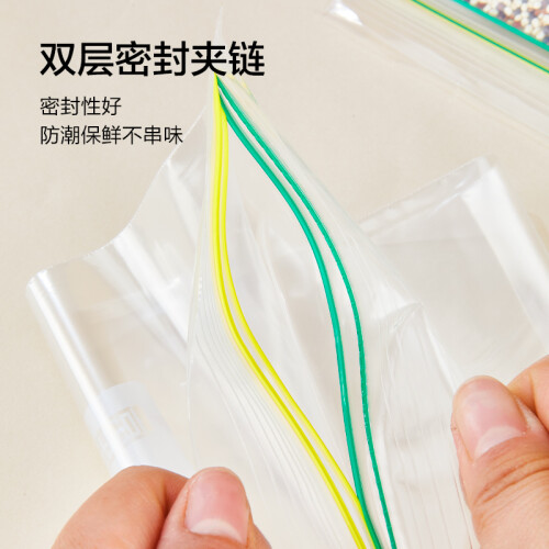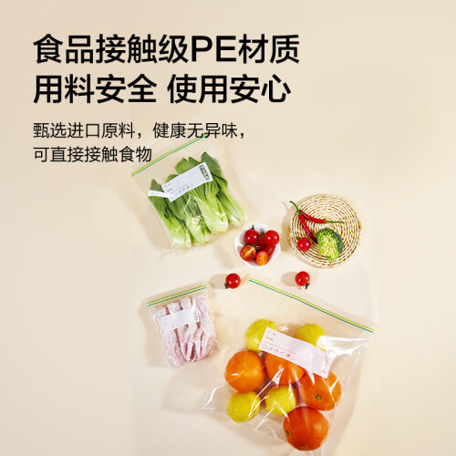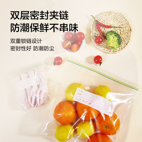 食品接触级PE材质,用料安全,使用安心,甄选进口原料,健康无异味,可直接接触食物,双层密封夹链,防潮保鲜不串味,双重锁链设计,密封性好,防潮防尘,强韧厚实,拉扯不易破漏,用料扎实,结实不易破损。