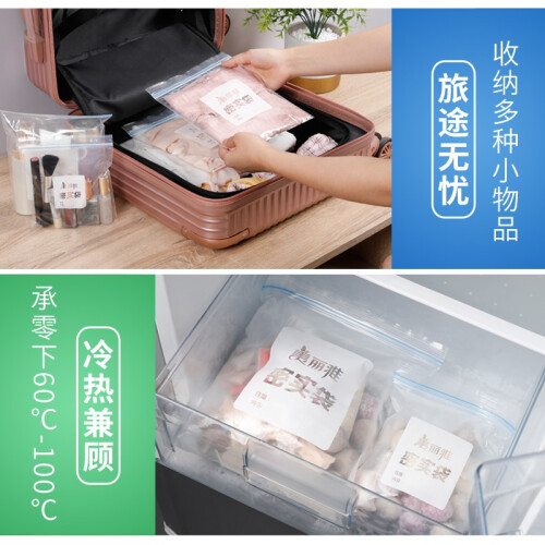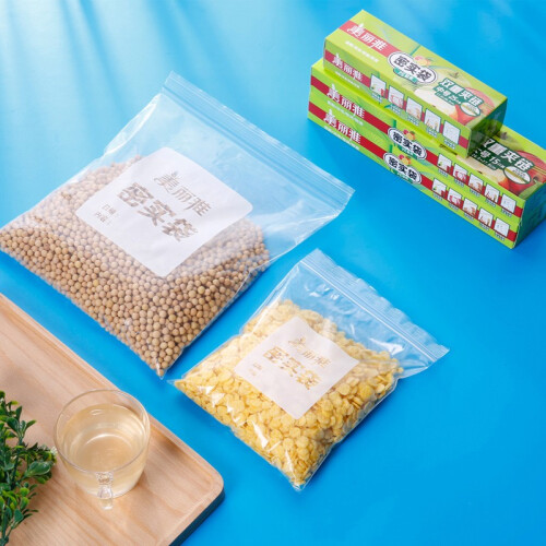 抽拉设计,无需点断撕拉,一抽一袋,双重密封,密封性能高,不易破裂漏气,防尘防潮保鲜,不易串味,记录处可书写,袋子印有备忘处,可记录保存的物品及时间,韧性可靠,耐撕拉。